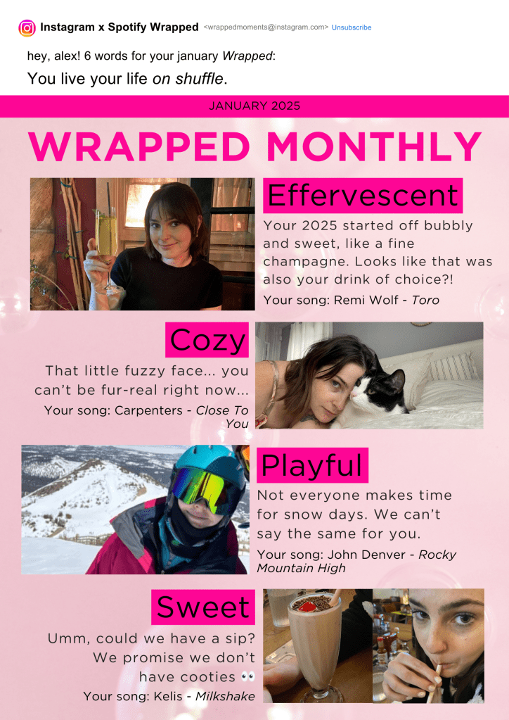 Spotify Wrapped is one of the most iconic marketing campaigns of the 21st century. After identifying that a large segment of Wrapped lovers also connect their Spotify accounts to Instagram, Wrapped Moments is born: a personalized end-of-year report that highlights how users incorporate their favorite Spotify songs into their Instagram posts and stories. Once they consent to AI facial recognition technology analyzing their profiles, users receive tailored reports like this one:
