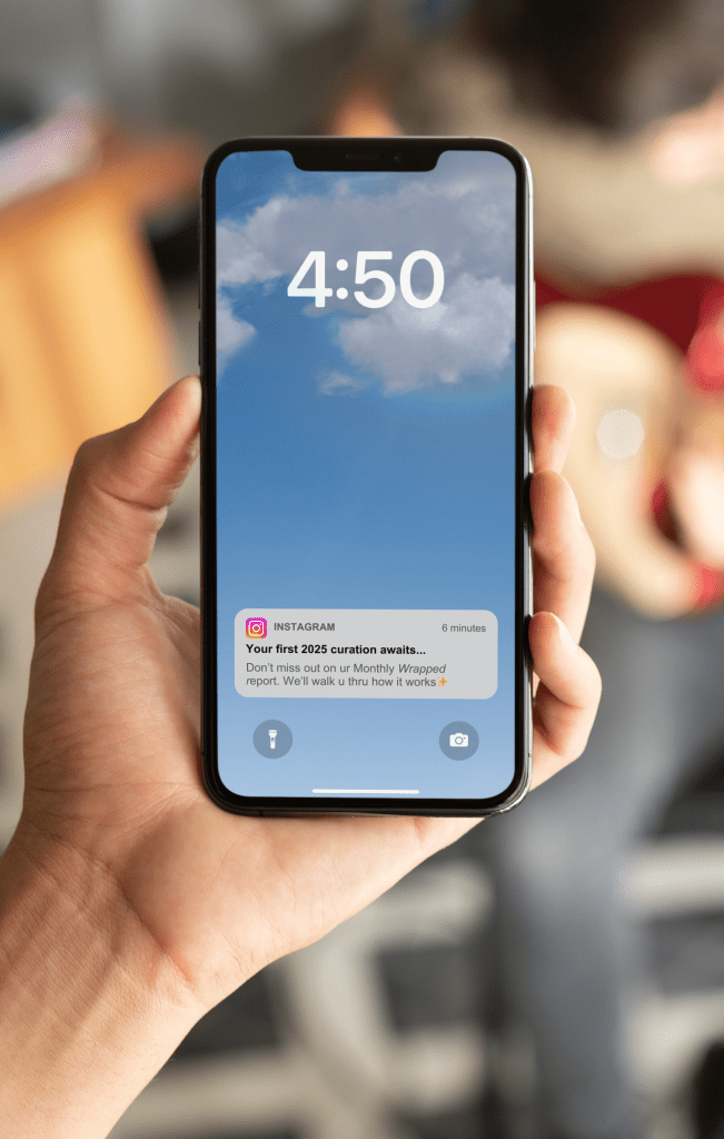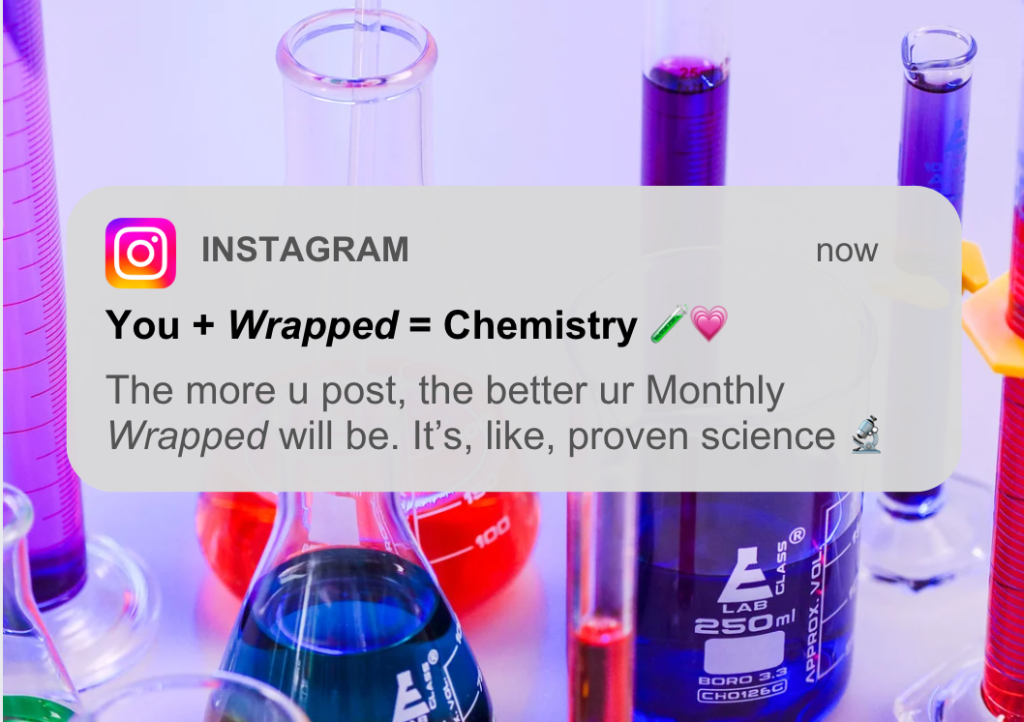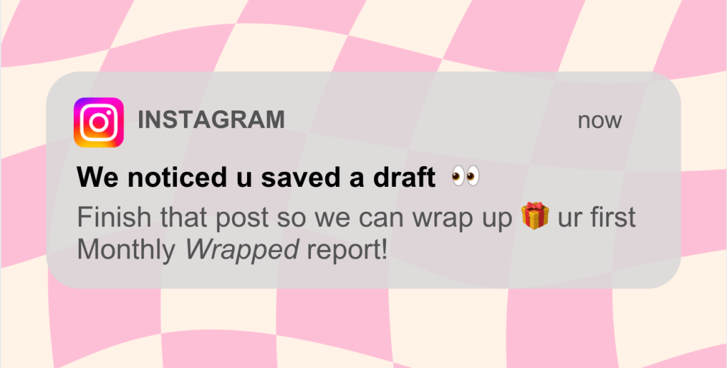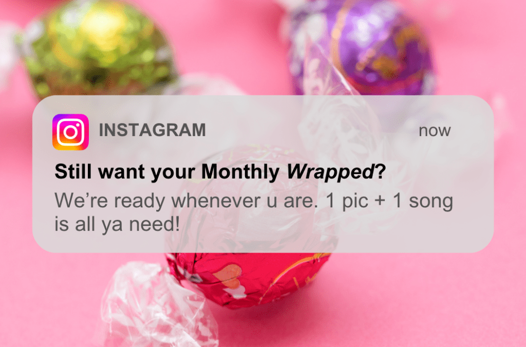 Waiting for Wrapped every December brings out a lot of people’s inner child, kinda like waiting for Santa every year. But unlike Santa (who’s bluffing when he says he can only bring presents once a year, btw), Instagram knows that it can keep its Wrapped cult following engaged year-round. To maintain momentum, IG asks users to opt in to a “Monthly Wrapped Moments Report”. Weekly notifications remind users to create posts and stories with their fave songs: